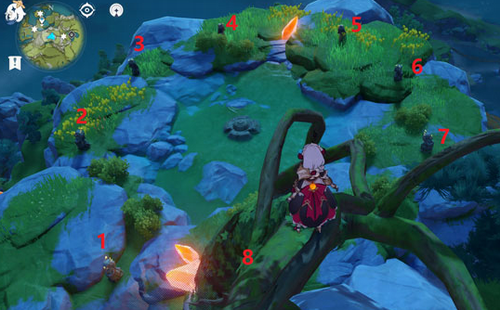 4、最后一个碎片在无妄坡的最高山峰处,达到最高处会看到八个石像,其中只有四个是正确的,正确的石像顺序是下图中7-1-4-2: