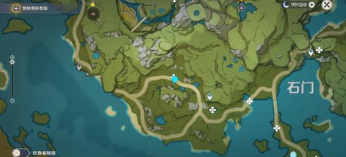 3、岩神像的碎片位置在轻策庄的西边,玩家去西边找一个黄色的大晶石就可以找到岩神像了,具体位置如下图: