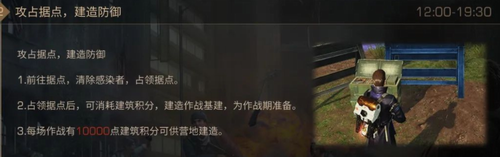 比赛当天的12:00-19:30为建造期,作战队伍内幸存者们可以通过活动入口的庇护城作战页签中的进入战场按钮传送进入战场,玩家可以前往战场据点清除感染者,清除后可以占领据点,地图中央会有辐射墙隔离双方阵营,需要等到作战期才会消失。