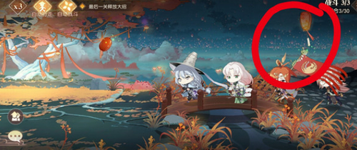 第二个缘分之火灯笼:君心似我心,具体位置是战斗1/3的蓝袍小男人。