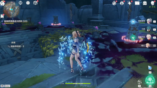 ②来到该处小遗迹的二层,需要点亮一处充能灯柱并引导两处仙灵照亮两处没有阳台的灯柱,然后我们站在有阳台这边的灯柱附近用我们携带的流明石触媒光芒解锁它,就会出现一个宝箱。