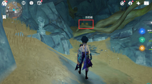 来到下图点位处(在高处,可跟随仙灵过来,别去下面找),攻击炸药桶炸开岩石。