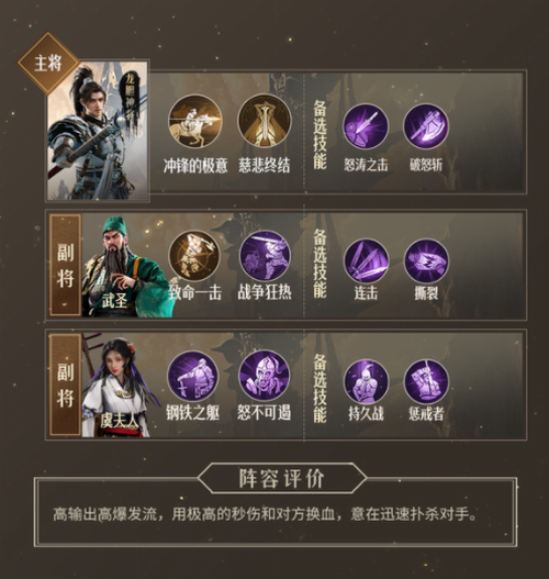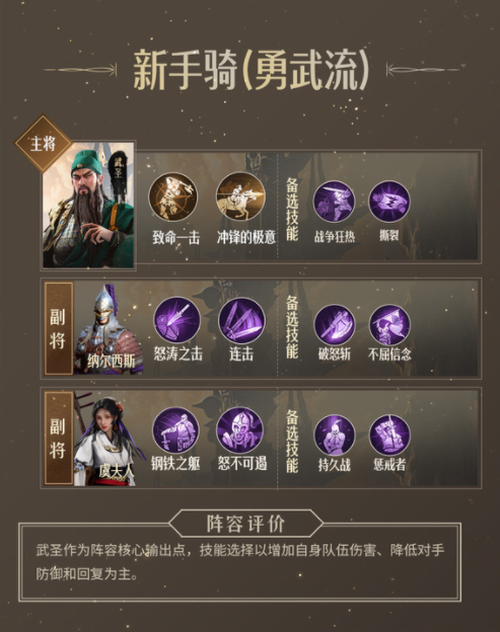 勇武流:武圣作为阵容核心输出点,技能选择以增加自身队伍伤害、降低对手防御和回复为主。