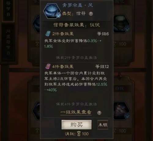 四件套效果:我军单位一个回合累计受到敌军两次伤害后,本回合再受到敌军主将造成的伤害降低40%(满级)