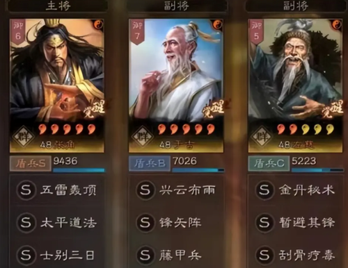 作为一只传统强队,但常见于1000区以前,1000区以后几乎看不到,为什么呢?因为这支队伍非常吃红度的,三仙的四维属性,防御是比较差的,很容易被人KO掉,即便有了藤甲的加持,白板还是容易暴毙,并且整支队伍主要依赖张角打伤害,张角不红很容易拉跨。而且这支队伍的共存也很差,占用了许多主流战法,所以这支队伍现在几乎在战场上见不到了,无论是白板还是满红,除非没啥将玩了不然这支队伍是不会选择的。