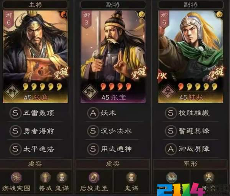 主将张角:勇者得前、太平道法;疾战突围+将威+鬼谋;全智力