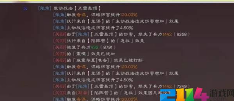 第一回合我方张角发动战法五雷轰顶触发奇谋队敌军关羽造成了三千点伤害并且施加了震慑效果。