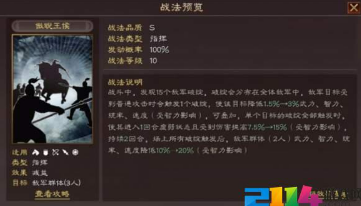 敌军目标受到普通攻击时会触发1个破绽,使该目标降低1.5% → 3%武力、智力、统率、速度(受智力影响),可叠加;