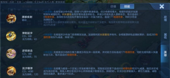 戈娅激活沙舟的引擎力量使沙舟反冲一段距离,并对前方目标造成120( +30%物理攻击)物理伤害,同时戈娅向敌人快速射击三次,每次造成60 + 15%物理攻击)物理伤害。