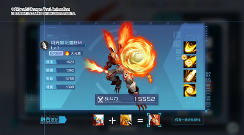 1、消耗数码宝贝经验和同调因子,可将闪光暴龙兽与阿波罗兽融合进化为超究极体数码宝贝闪光暴龙兽BM。