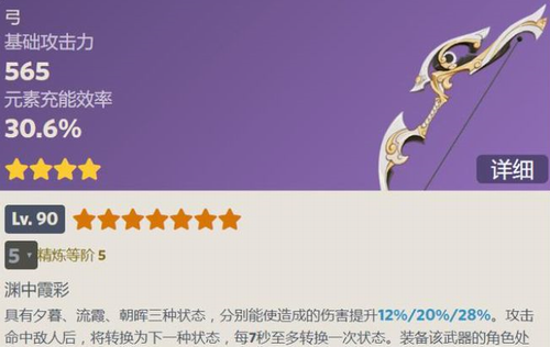·具有夕暮、流霞、朝晖三种状态,分别能使造成的伤害提升(6/7.5/9/10.5/12%)/(10/12.5/15/17.5/20%)/(14/17.5/21/24.5/28%)。攻击命中敌人后,将转换为下一种状态,每7秒至多转换一次状态。装备该武器的角色处于队伍后台时该效果依旧能触发转换。