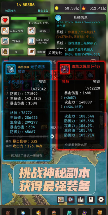 装备传承:最高装备超过15级后,后面的装备穿上就强化最高装备-15级,最高15级,所以开局最重要的事就是把一件1级装备强化到30级,可以在包里自动强化到15,然后用云存档/读档,强化成功就存档,失败就读档,很快就30了。