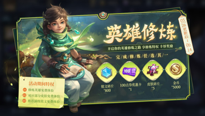 修炼过程中可获得英雄试用资格(全模式可用)、部分皮肤使用资格(直售的史诗(英雄修炼活动开启前3个月内新上架的皮肤除外)及以下等级皮肤)、满级系统铭文试用(仅修炼英雄可用);修炼达到2000能量可得英雄梦境修炼礼盒。