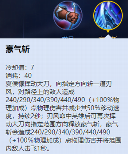 技能介绍:夏侯惇挥动大刀,向指定方向斩一道刃风,对路径上的敌人造成240/290/340/390/440/490(+100%物理加成)点物理伤害并减少其50%移动速度,持续2秒;刃风命中英雄后可再次挥动大刀向指定范围方向释放豪气斩,豪气斩会造成240/290/340/390/440/490(+100%物理加成)点物理伤害并将范围内敌人击飞1秒