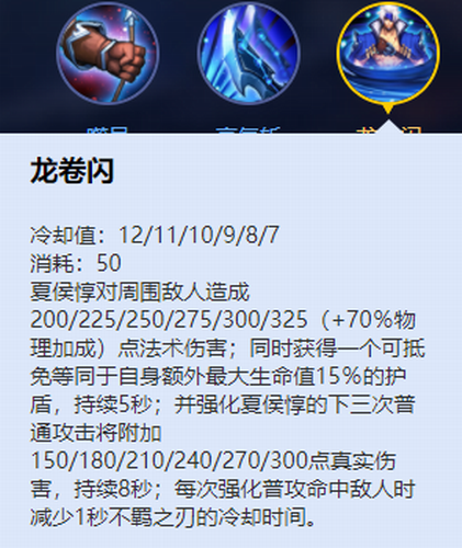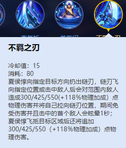 技能介绍:夏侯惇对周围敌人造成200/225/250/275/300/325(+70%物理加成)点法术伤害;同时获得一个可抵免等同于自身额外最大生命值15%的护盾,持续5秒;并且夏侯惇的下三次普通攻击将附加100点真实伤害,持续8秒;每次强化普攻命中敌人时减少1秒不羁之刃的冷却时间
