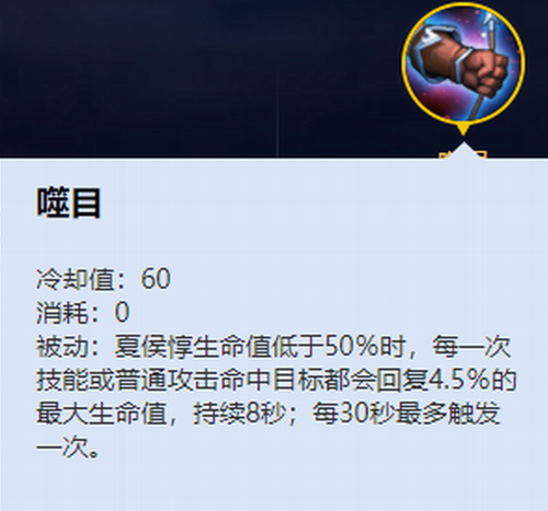 技能介绍:被动:夏侯惇生命值低于50%时,每一次技能或普通攻击命中目标都会回复3%的最大生命值,持续8秒;每30秒最多触发一次