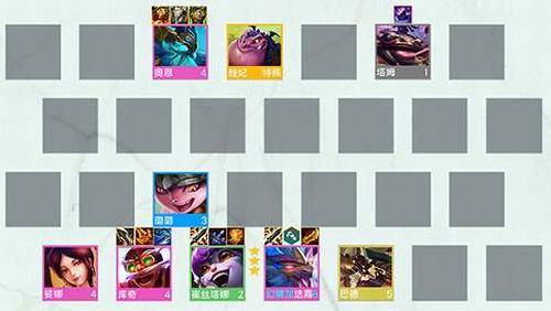 棋子:璐璐+小炮+塔姆+娑娜+奥恩+库奇+迭嘉+巴德