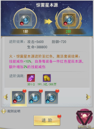 本源初始为1阶,消耗“星海银晶”与魂币可进行进阶,每个本源最高可升至5阶。进阶可获得大量的基础属性与特殊属性;