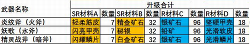 每种武器锻造需要三种材料,对应后续图中SR材料B、R材料C、R材料D,数量分别为4/12/6,锻造所需材料未包含在升级合计中