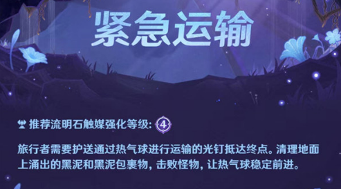 挑战完成条件:我们需要在五分钟内将我们的热气球运输到指定的地点,我们会在途中遇到魔物以及黑泥,当黑泥与魔物出现时,我们的热气球便会停止行动。