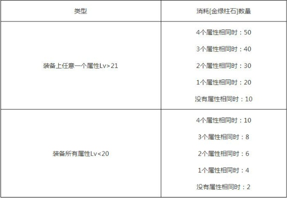 金绿柱石的消耗量根据当前装备Lv、两件装备是否有相同属性决定。