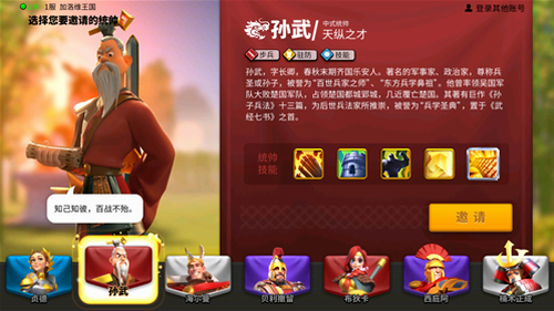 当然,玩家如果有喜欢的别的统帅,也是可以根据自己的喜好选择的,之后自己努力的获得更强大的统帅就可以了。