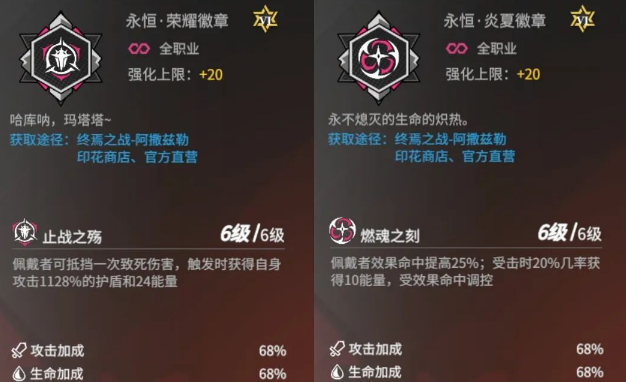徽章方面,因海柔尔注重自身生存保命,使佩戴者免死一次的荣耀徽章与其非常契合,提高效果命中的炎夏徽章也是不错的选择。