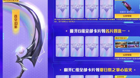 ABC三组的奖励分别是烟雾弹、模式专属名片、近战武器。每游戏20分钟可翻一次牌,翻到的牌不会重复获得,累计翻牌12次就可以获得全部奖励,左边的十周年专属近战武器“苍空幻影”呢是等你把ABC组的奖励都拿到后才能领取,“苍空幻影”是一把四星武器,放在神武宝库再好不过,毕竟四星武器除了冥王剑和少的可怜的猎场专属武器是四星,其余没了。