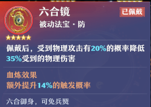 血炼推荐:额外提升百分比的触发几率。或佩戴者的灵兽也会受到保护,但触发概率为主人的百分比。与【六合镜】视情况二选一佩戴。