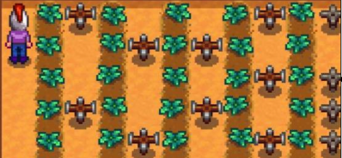 3、记住还要准备多一点高级洒水器,有规律的摆好。上面还可以种上仙人掌,那个虽然卖不到高价钱,但是可以快速补充能量。