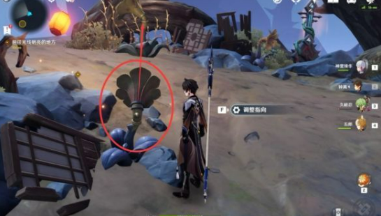 15、前往竖琴位置,把第一个喇叭调整方向三次,调整喇叭朝向阻挡水脉石头。