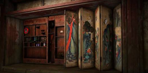 4、拿到神秘钥匙,进入密室后,对着屏风中间按F获得装备。