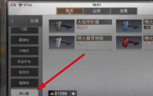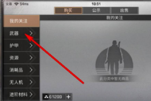 2、点击交易后,在打开的界面点击购买后再点击武器选项。