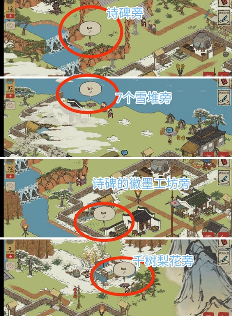 诗碑旁;7个雪堆旁;徽墨工坊旁 ;千树梨花旁(被松树挡住了)