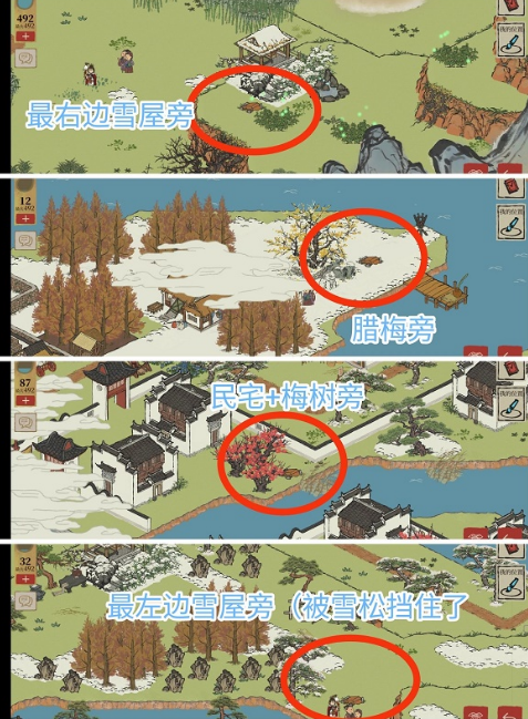 最右边雪屋旁;腊梅旁;民宅+梅树旁;最左边雪屋旁(被雪松挡住了)