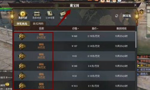 1、氪金,在藏宝阁中可通过玩家购买出售直接获得铜币。
