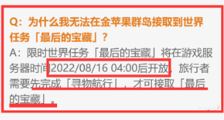 限时世界任务「最后的宝藏」将在游戏服务器时间2022年8月16日 04:00后开放,旅行者需要先完成「寻物航行」,才可接取「最后的宝藏」