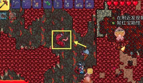 3、此处我们需要找到猩红宝箱怪,只要不靠近它,它看上去就是一口非常正常的猩红宝箱,一旦玩家接近了,猩红宝箱怪开始攻击玩家。如下图所示: