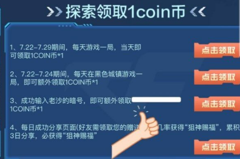 2、7.22-7.24期间,每天在黑色城镇游戏一局,即可额外领取1COIN币*1