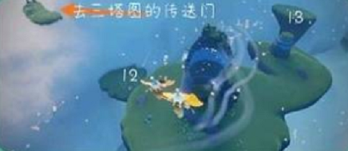 2、三塔图(6个):先进三塔图中间的平台上有1个,再去左侧塔下双人门内有1个,上到最高塔上有1个,下来之后从右侧小岛双人门进入八人间副本,就看见一颗巨木的树洞内有1个,然后到终点神殿的屋檐上有1个。