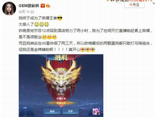邓紫棋表示昨晚录完节目12点回到酒店努力了两小时,就为了在明天打直播前赶紧上荣耀。而她在48星徘徊了两三天,所以昨晚最后的两颗星只敢打马瑶组合,但她还是金牌辅助,真开心。