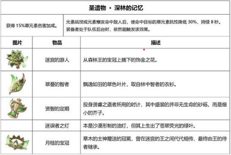 4件套:元素战技或元素爆发命中敌人后,使命中目标的草元素抗性降低30%,持续8秒。装备者处于队伍后台时,依然能触发该效果。