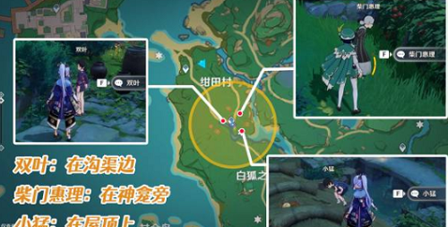2、虽然绀田村的村民有不少,但能提供具体线索的只有双叶、柴门惠理和小勐。提供线索的村民位置见下图。