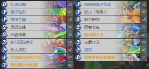 卡组整体是和上个版本快攻瞎一样的,前期很依赖凶恶的滑矛纳迦和历战先锋抢血,案卷书虫前期的超模身材也能站稳场面。卡组有一个思路是带上了剃刀野猪+剃刀沼泽兽王+贪食的克里克西斯这一套套娃组件提高一个卡组上限。这个卡组前期就是要尽可能去倾泻手牌压节奏,比较依赖神抽放大战刃或者贪食的克里克西斯的过牌效果,上下限有点太大了。