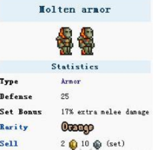 3、全套盔甲有25点基础防御力,加上17%近战伤害加成。如果能看到全套盔甲的话,它会有一种类似流星盔甲的火光轨迹。然而,熔岩盔甲会发出更多的火光粒子。