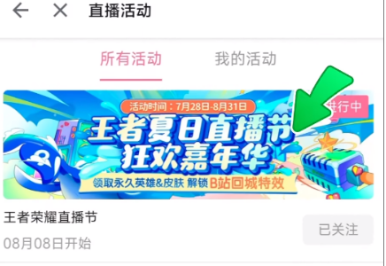 3、在直播活动中找到最新8月8日开启的的王者夏日直播节狂欢嘉年华活动。