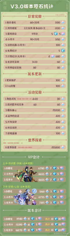 原神3.0版本可以获得原石总数 3.0版本原石获取分享