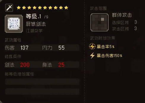 获取方法:出了樊城南门,往左走进山洞,进入黑风寨4杀掉守门的蛇怪,进入剑冢右上角进入剑冢幽谷,在这里打老婆婆(请存档)战胜后进入房间选择嘲讽技能,获得【厨娘剑法】