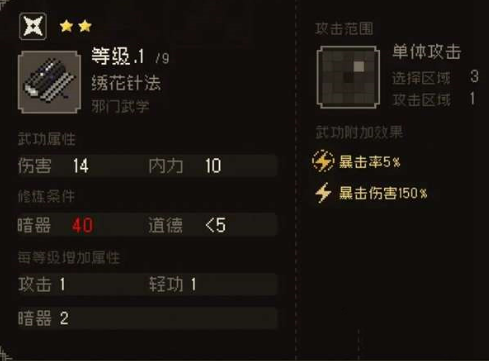 获取方法:先去江凌渡口触发上官楠剧情上官楠到了江夏后,进入江夏,自动进入剧情(江南鬼手会偷夜希夷的东西,这三个选项我都不管,只要你有没有鬼手)进入左边的小树林,和鬼手对话,选择第二个选项(滑稽)打完四只鸡后,邀请入队(道德≤5)在右下角的酒馆门口触发剧情夜希夷自动加入队伍获得【绣花针法】