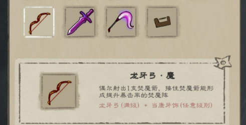 龙牙弓:发射全屏范围内随机弹射无视障碍的箭矢,拥有高额的伤害和穿透性。进化方向推荐为魔器,进化为魔器以后可以为玩家生成一个提升100%暴击率的焚魔阵,配合100%的暴击率加成和法宝攻击特性,绝对T0神器。